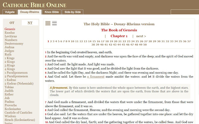 Baronius Press has just launched a new website: www.CatholicBible.Online, with the full texts of the Clementina Vulgata, the Douay-Rheims Bible (Challoner revision, 1899 printing) and the Knox Bible.