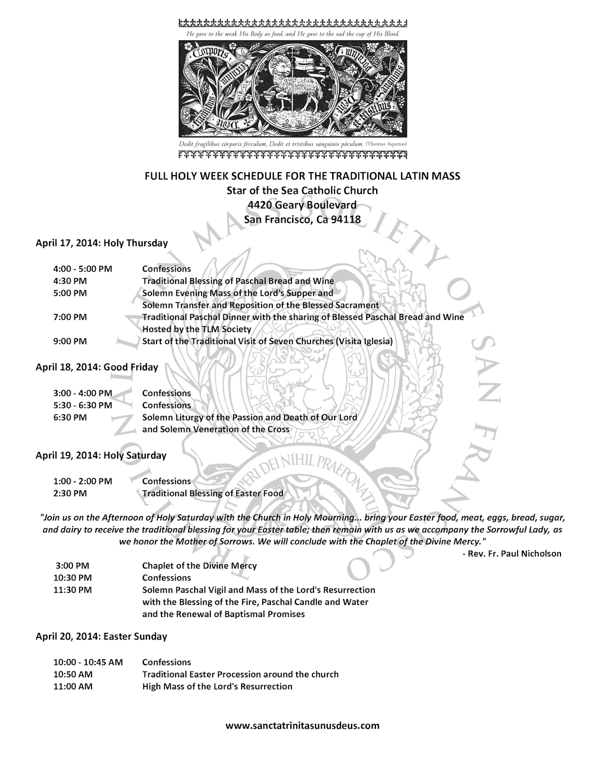 - Palm Sunday: 8:30 am Low Mass, 10:30 am High Mass, 1:00 pm Low Mass, 3:00 pm Vespers